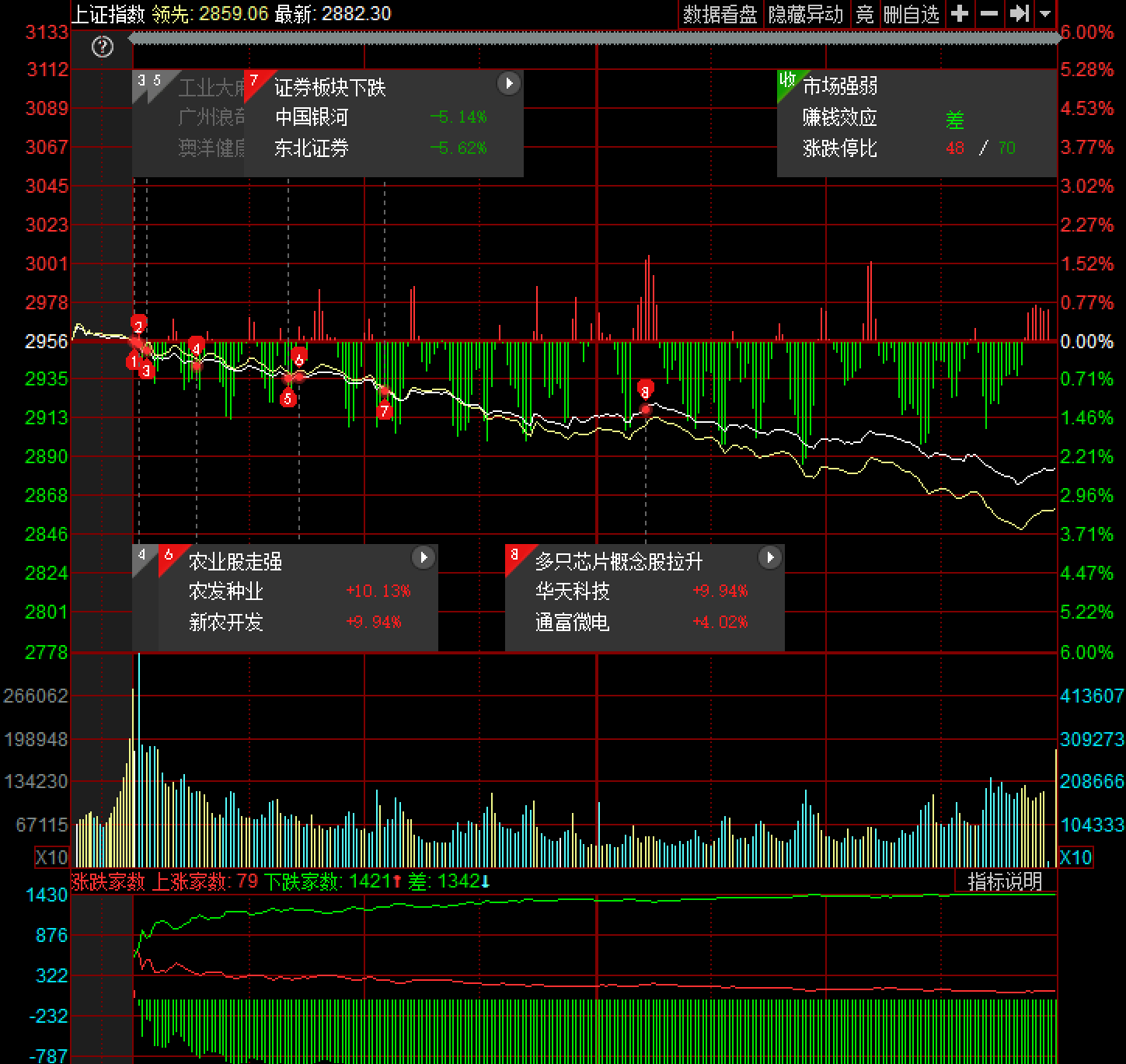 今天市场调整幅度较大,主要原因在于沪指触及此前分析的2850-2950震荡磨底区间上沿后的正常调整,加上人民币汇率继续贬值刺激港资净流出52亿,加剧了调整幅度。