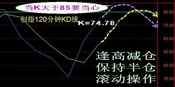 当前,120分钟K值为74.78,还有上冲空间,大于85要当心。
