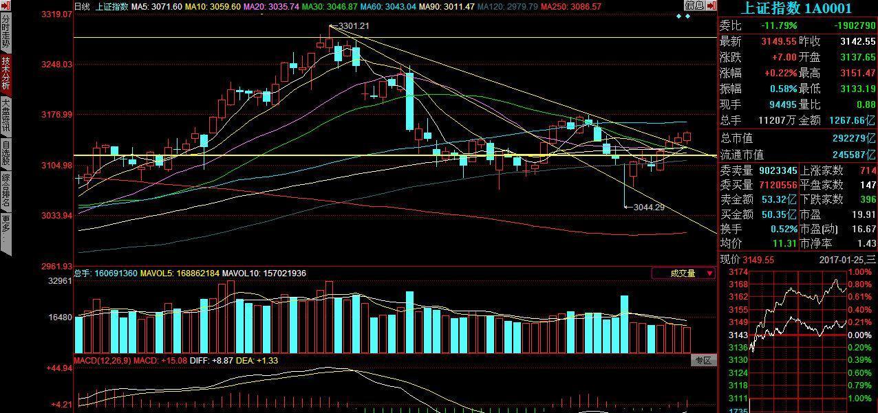 4、K线综述:从上证综指看,主板维持前期观点不变,即3170的理论目标指引着方向,由于成交量出现节日萎靡尚属正常,从日线图看短线均线系统有助涨趋势,结合成交量萎缩,明日收阳概率依旧较高,且幅度可能高于今日,主板建议中仓甚至高仓过年;创业板秉持前期观点中期底部远未出现,1900附近压力较大,1950附近压力巨大,短线看,继续低位横盘小阳概率较大,但是操作难度较高,创业板建议低配甚至不配过年。