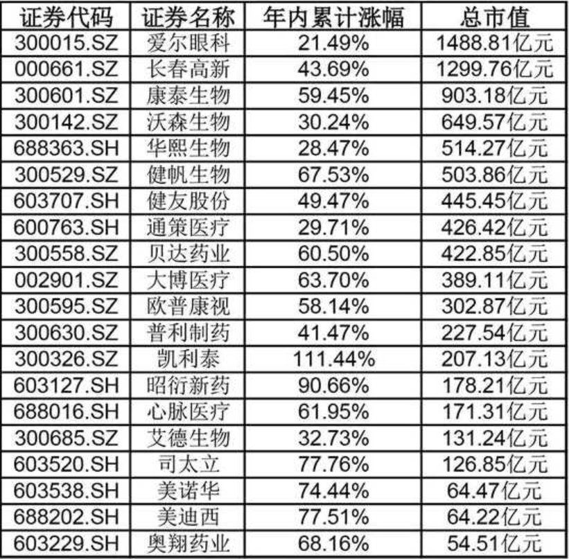 医药生物行业中,有20只个股早盘股价刷新历史新高,同样多为细分领域龙头公司,如眼科医疗龙头爱尔眼科,生长激素龙头长春高新,疫苗龙头康泰生物等。