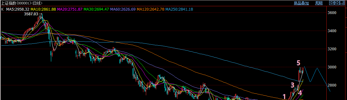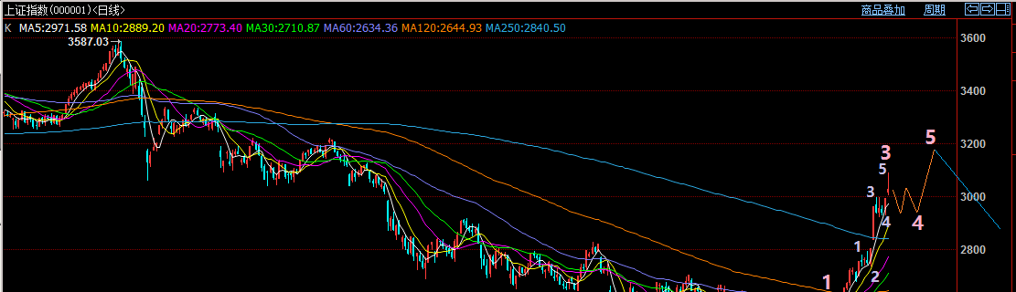 图二、今日的走势预示大盘正在走这种走势。今日的冲高完成了主升浪3浪的上涨,随后大盘将迎来4浪调整,首先大盘可能会回探2900-2950点位置,然后在2900到3050点之间震荡洗盘,之后再最后冲一下3150-3200点位置,完成5浪上涨,结束这一波春季反弹行情;