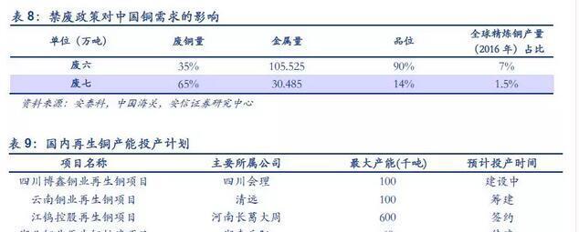 再生铜方面,变数主要来自中国废铜进口禁令的冲击,据安泰科估计,禁止“废七类”铜进口将从 2018 年底开始影响国内约 30 万吨/年再生铜供应。