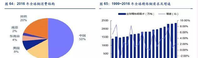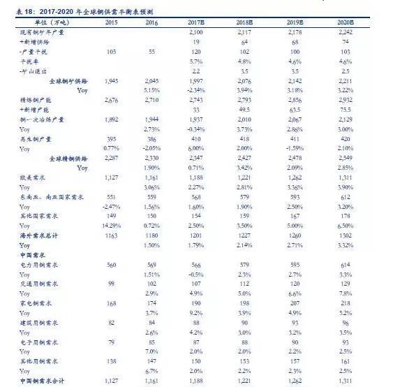 1)国内方面, 中国配电网建设加速、 家电行业相对景气以及新能源汽车稳步发展都将对精炼铜的需求提供中长期支撑,预计中国 2017-2020 年铜需求复合增速有望升至 3.35%, 2020 年达到 1311 万吨,全球占比仍约50%。