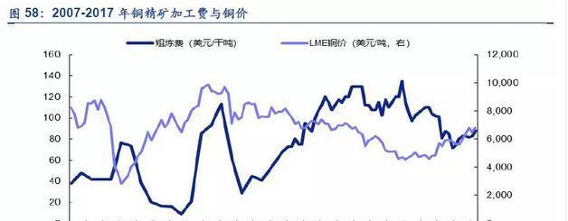 铜冶炼加工费和铜矿增速密切相关, 2016 年随着铜精矿趋紧,加工费即进入下降通道, 2017年末 CSPT 接受的 TC&RC( 82.25 美元/吨&8.225 美分/磅)再度下降又进一步确认了此趋势。