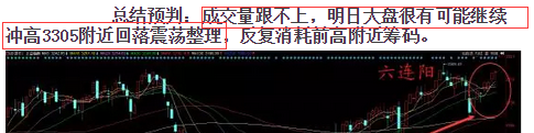 昨日一姐说过大盘成交量跟不上,今日很有可能继续冲高3305前高附近回落震荡。今日大盘走势基本符合预判。