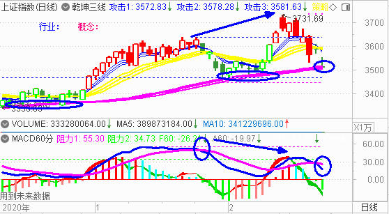 技术上,大盘大幅低开调整受到乾坤三线之紫线支撑。大盘60分钟MACD维持空头排列。下周大盘强支撑或分水岭在3480点处。