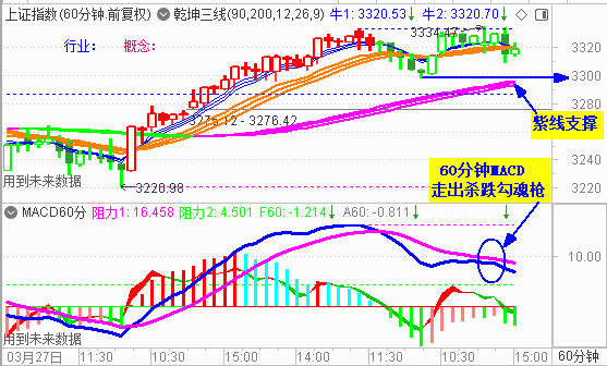 大盘60分钟的MACD二线维持空头排列,上午二线维持粘合状态,午后大盘不出意外出现变盘,并走出预期中杀跌勾魂枪。