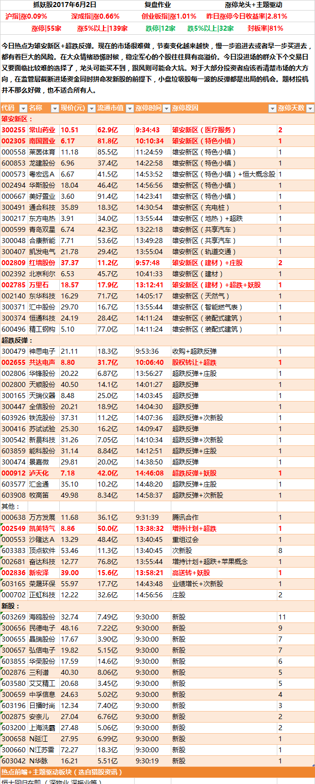 由于今创业板的走强,中小盘股开始活跃。下仍然关注雄安板块的反弹能否持续,和最近连续跌停的次新股能否止跌并反弹。