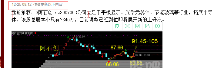 喜报,喜报。昨天早盘老张直播间公开推荐的牛股$阿石创 sz300706$ 盘中大涨七个点以上,今日盘中继续表现,截至目前大涨五个点以上,恭喜先知先觉跟上老张节奏一同潜伏的兄弟们,此股目前收益12%以上了。恭喜战队的兄弟们吃肉,666 实力有目共睹。 此股目前跟上节奏一同获利了结,入袋为安,两天收益10%以上已经很不错了。 附图:拒绝马后炮