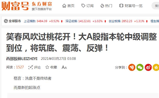 上周周日(3.27),我d的财富号《笑春风吹过桃花开!大A股指本轮中级调整到位,将筑底、震荡、反弹!西部股神LEIZHIYI2021年03月27日 03:08》是对本周一周的总体研判和分析,我在文章中说: