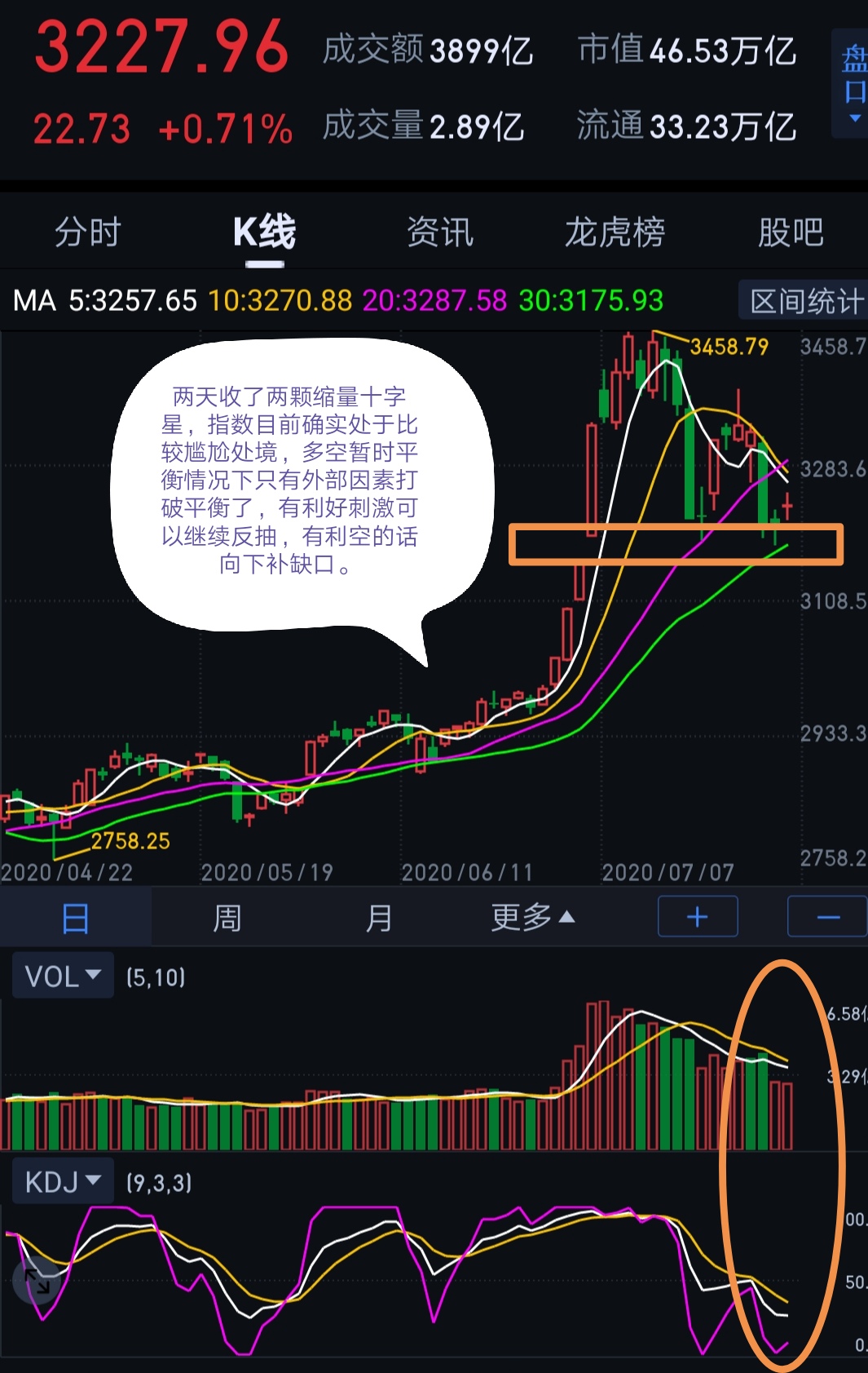 从目前市场走势看处于相当尴尬处境,两天两颗十字星说明多空暂时平衡,上涨动力不足、下跌空头能量枯寂,因此短期来说如果没有外力刺激的话,恐怕很难出现大的波动,如果有利空打压指数就会向下继续补缺口,但杀跌幅度有限,而如果有利好刺激大盘因为技术指标处好,反弹力度就会强一点。就市场中长期趋势向好格局没有改变,但是周线级别调整已经很明显,调整时间5~8周,目前是调整的第三周,至于调整的形式我倾向于箱体震荡格局为主,箱体的底部就在3150点附近,极限位就是3100点,箱体的箱顶就是3458点附近。