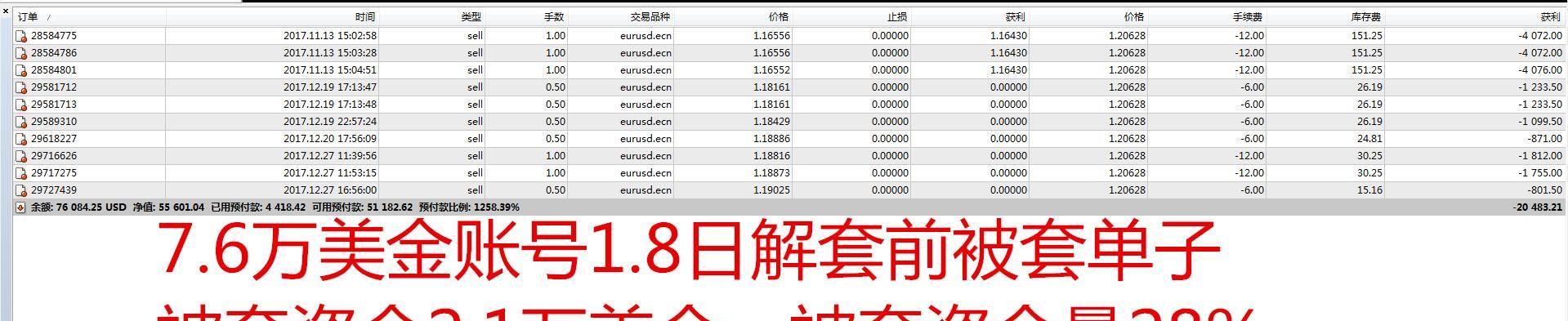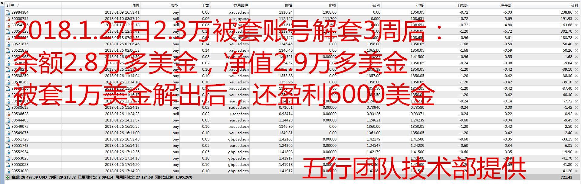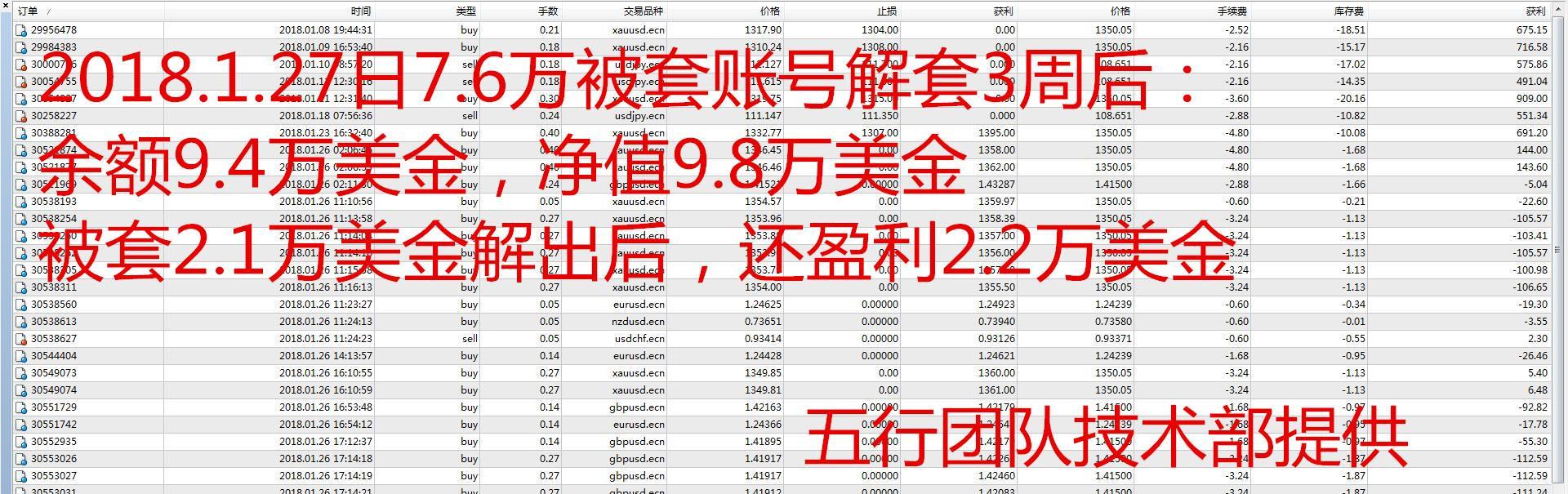 针对市场,马丁系列ea造成账户不可扭转的亏损或人工等策略账户出现“天地”锁、较大浮亏的套单,五行团队通过减仓、锁仓、重新布局,一般可实现如下成效