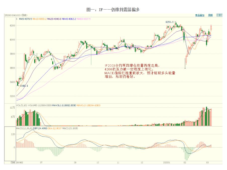 IF2003合约周四增仓放量再度走高,4200的压力被一定程度上消化。MACD指标红柱重新放大,预计短期多头能量增加,后期仍看好