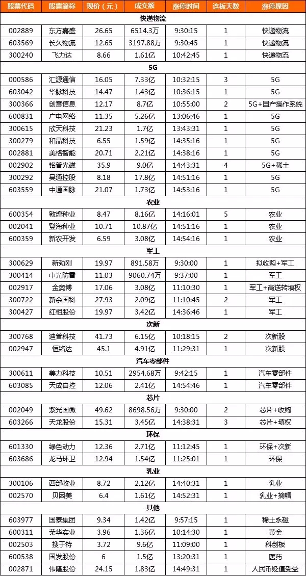 附前一个交易日涨停股原因:主要集中在5G、物流快递,整体表现一般。
