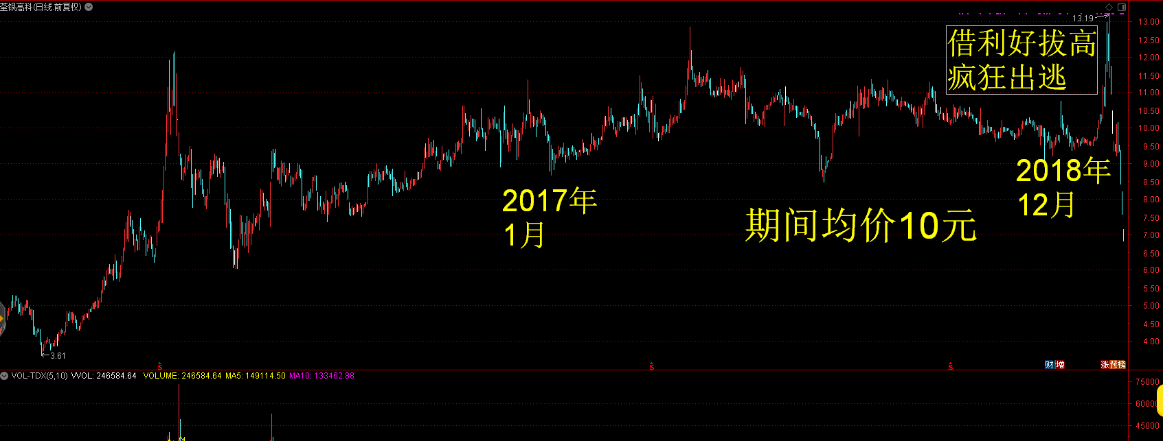 然后2018年遇见超级大熊市,毕竟该股持股十分集中,该笔资金稳稳的护住股价。股权转让利好兑现的时候,借机大幅拉升,从10元不到直接对敲拉升到13,然后用高台跳水方式出货。往上拉升过程成交量是对敲,杀跌过程从9往6的过程才是出货为主。