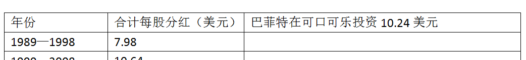 因为可口可乐股本扩张太大,2012年前巴菲特持股数量难以准确核实,但是2012年7月后可口可乐股本结构变动不大,根据最近伯克希尔哈撒韦持股4亿股计算,仅仅在2012年7月至2018年,巴菲特就收到可口可乐分红34亿美元左右,完全覆盖最初投资成本10.24亿美元。2018年巴菲特收到可口可乐分股分红为0.39美元*4次分红*4亿股=6.24美元,是当年投资额的61%!