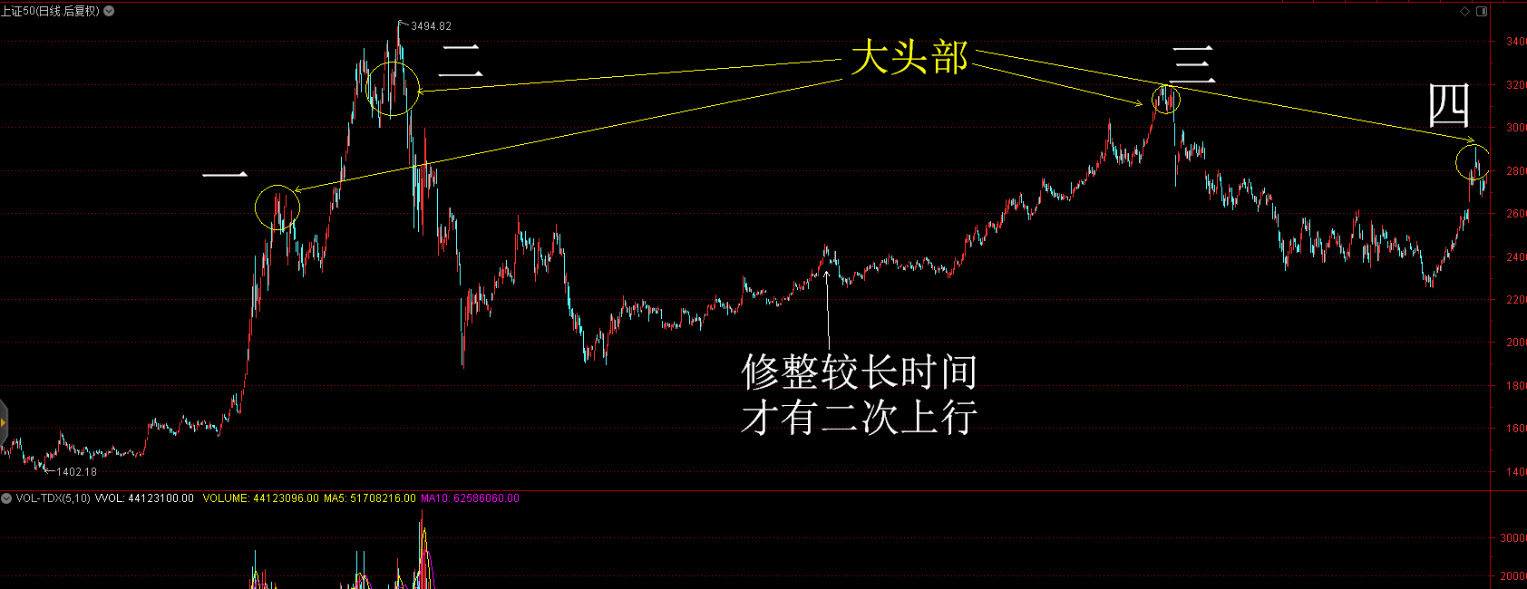 2015年牛市第一个头部,50指数从一月修整到3月。第二个头部是4—6月。第三个头部前期有一个小头部,放量程度不够涨幅也不够,所以修整仅仅一个月再做超级大头部。我们这次即使不是大型头部,也要修整最少两个月,因为放量和短期涨幅都够大。