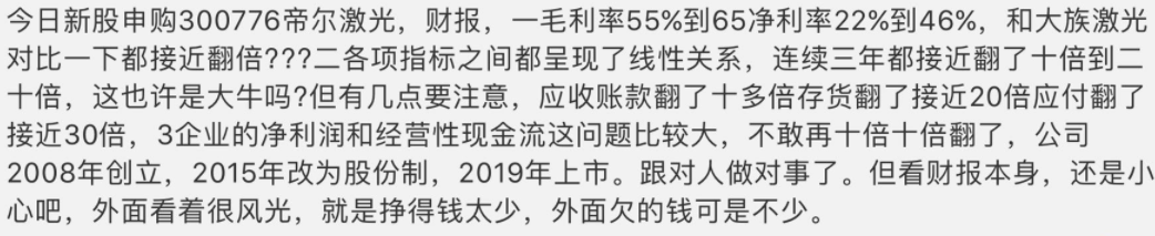 昨天一位投资者,对即将上市的帝尔激光做出分析,你看他的结论,对财报对公司定义极为准确,已经能通过报表极快的解读一家上市公司过去到底怎样,真实情况到底如何!