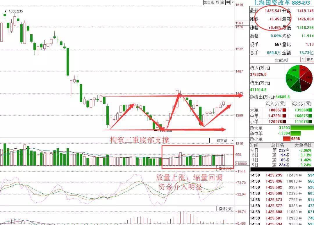 大家不妨看下,上海国资改革的走势,目前处于箱体震荡区间,不但构筑三重底部支撑,还呈现放量上涨,缩量回调的现象,说明有资金在介入吸筹。近期更是出现持续堆量,一旦放量突破箱体上沿,向上空间有望进一步打开。
