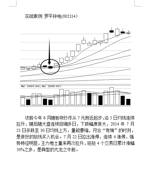 选股应该择强汰弱,挑选当前正处强势拉升阶段的个股,要在强势股“大红大紫”时设法分一杯羹,关键是要把握买入的时机,若在强势股连拉数个涨停之后再跟进,很可能庄家来个急刹车,买到的是短线高点。古语云,“亢龙有悔”,既然是“亢龙”,必然是实力强劲的主力,在其连续飙升的时候不妨静观其变,紧紧把握其“有悔”的时刻,亦即是回落企稳的时刻介入,一是保证买到的个股属于强势股,二是避免了追高风险,可见,买得早不如买得巧,“亢龙有悔”亦为一种可靠的买入信号,其形态特征为: