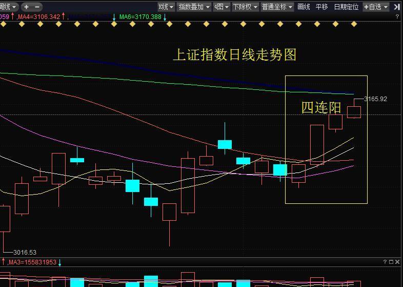 首先上证指数到目前为止已经呈现了四连阳的状态,大盘自3016点反弹以来,整个结构当中没有出现过五连阳的状态。