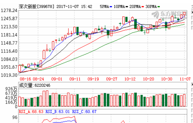 今天前半市看,沪市由于“二桶油+保险股”护盘,表现强势,深市创业反作1845-1851之间小幅波动,主力对待创业板还是小心奕奕,14时起深市次新股明显由于主力资金操底,出现了价增量涨之势,可以说在大盘跌无可跌之间,主力资金增加了仓位,创业板今天新增资金为60亿,其中次新股板块新增资金为27亿,占了近一半的资金,从深市次新股指数上看,平台向上突破,后市将加速上涨,次新股将会迎来火爆炒作。