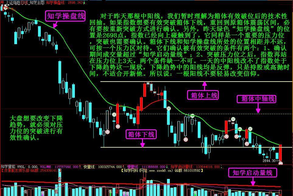 对于昨天那根中阳线,我们暂时理解为箱体有效破位后的技术性回抽。如果指数想要有效突破箱体下线,重回到原箱体震荡区间,必有要按重新突破方式进行确认。另外,昨天绿色“知学操盘线”的位置是2698点,指数已经向上碰触到了,它同样是一个重要的压力位,突破也需要确认。