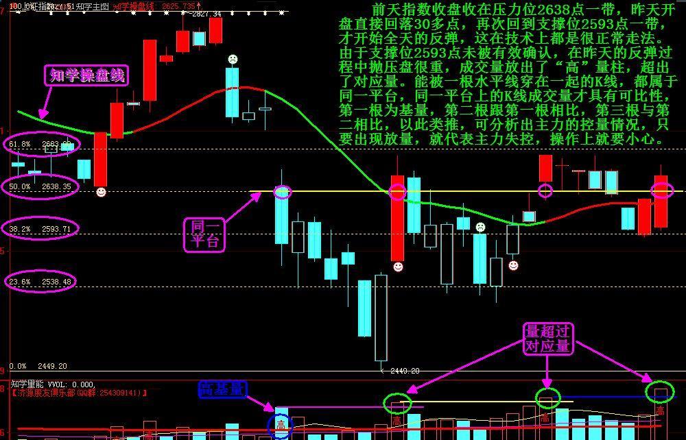 前天指数收盘收在压力位2638点一带,向上有较强压力,昨天开盘就直接回落30多点,释放压力,指数再次回到了支撑位2593点一带,得到支撑后,才开始全天的反弹,这在技术上都是很正常走法。由于支撑位2593点未被有效“确认”过,在昨天的反弹过程中抛压盘很重,全天成交量放出了“高”量柱,超出了“对应量”。