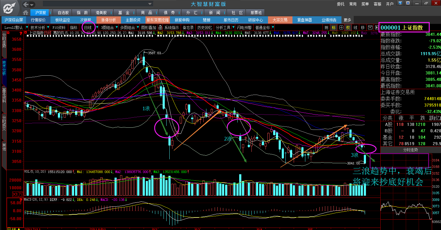 技术上,三大指数断崖下挫留下巨阴,2月9日、3月23日、5月30人三个向下跳空缺口,且形成孤岛反转,这在技术上是最为恶劣的形态之一;从波浪理论看来,1月29日3587开始第一浪下跌,那么今天跳空大阴就是第三浪下跌,也就是说这是最后一个下跌浪,未来支撑位才最关键,那就是周线级别的年线2960点附近。未来若无重大政策消息面来改善,一般需要一两个月来修复缺口!