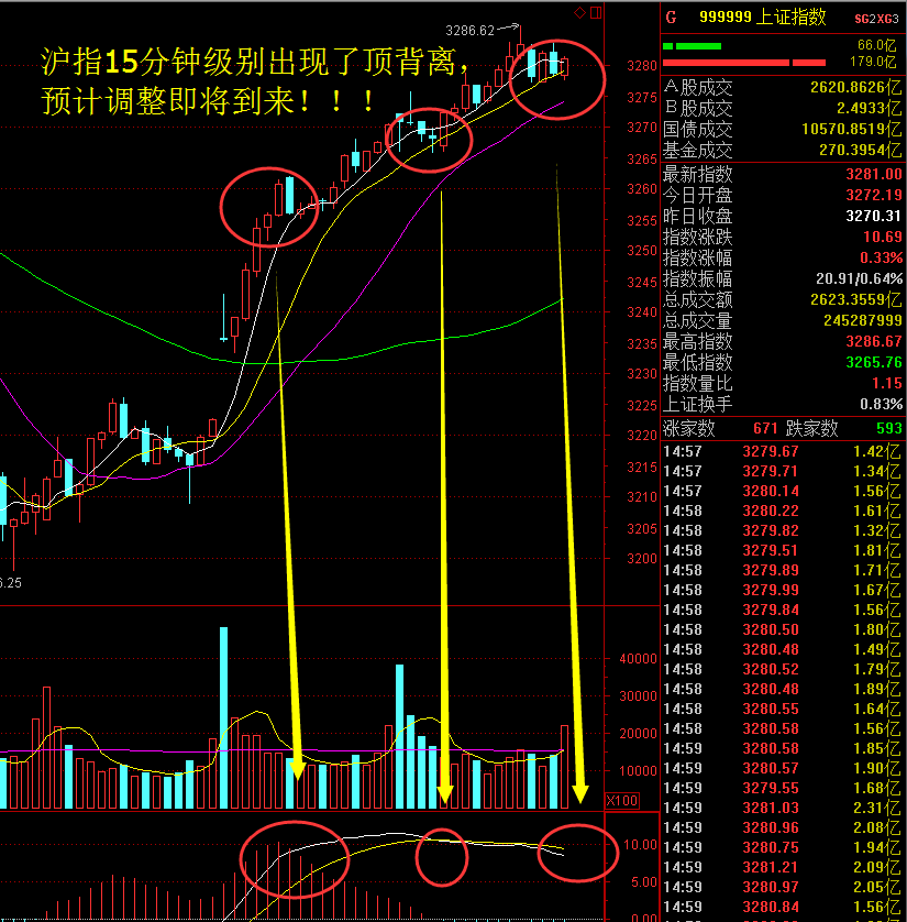 所以这里的变数仍然较大,投资者需要有两手准备,仓位上不要过分激进。在沪指15分钟结构上顶背离结构正在构建过程当中,最快明天下午最慢下周一市场就会出现调整,如图: