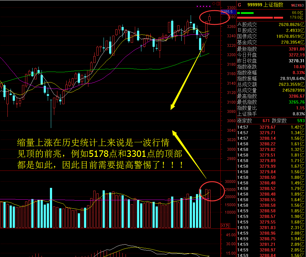 今日两市延续昨日上升趋势继续上冲,雄安新区继续暴涨但涨停家数大幅减少个股出现分化,一带一路、高铁继续活跃但指标品种尾盘表现偏软,前期龙头板块港口再度回归是好现象,但中小创品种表现平平,市场总体看来与昨日火爆程度相比衰减了很多。沪指来看今日阳线实体与昨日相比大幅缩短,而成交量仅比昨日萎缩了一点点,所以有些“放量滞涨”的迹象了,上方3300点附近压力似乎仍然不小,不排除冲击此关口前还会有一次回踩,若出现回踩则下方支撑区间在3250-3270点附近。从历史统计身上看,缩量上涨是一波行情见顶的前兆,例如2015年的5178点和去年年底的3301点两个顶部,都是先出现了缩量上涨之后再见顶的,因此现在要提高警惕了,如图: