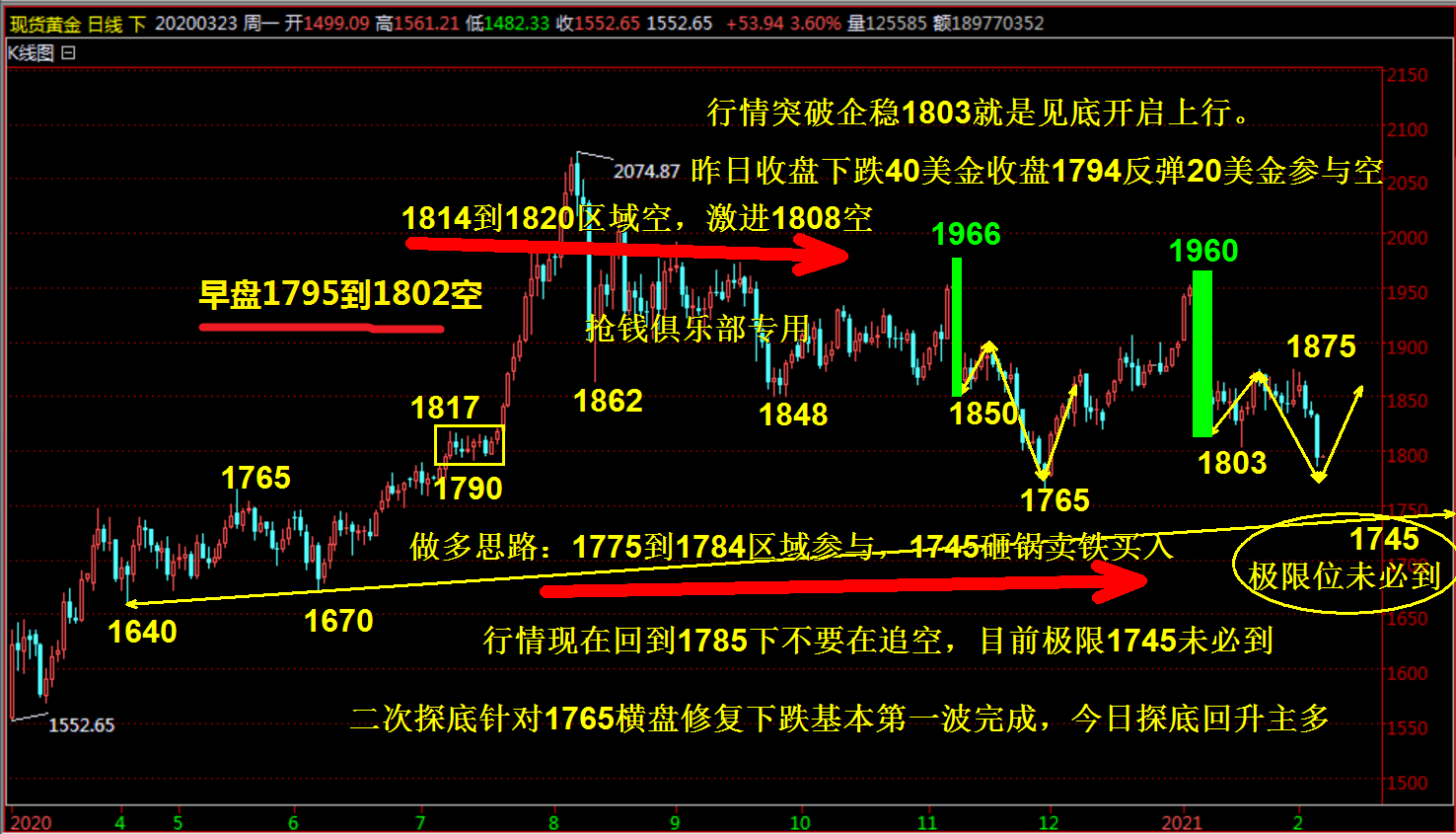 这个时候就是做空反弹主趋势,以前反弹都是50%位置再次下跌,自1847下跌1787那就是60美金下跌反弹50%那就是1817安全,当然目前看前期1817到1802做了横盘整理那么上下轨变压力和反弹50%相符,而且连续下跌多头人气涣散,昨日反弹20美金早上再次收复,那么说明空头控制盘面,1817暂时可望不可及,那么现在1802都是做空区域,昨日凌晨下跌1792反弹1800再次下跌,那即是说今日早盘1800到1803区域就是做空1810损足以,激进早上1795都是直接空止损1805目标都是1773到1765到1745如果1745破位那么就是告别1700时代,直接1680到1650区域了。也即是说后期中线多位置大概率1650这里,如果这里失守那就是到1450区域甚至更低毕竟资金大幅撤离,避险不在黄金落地凤凰不如鸡。
