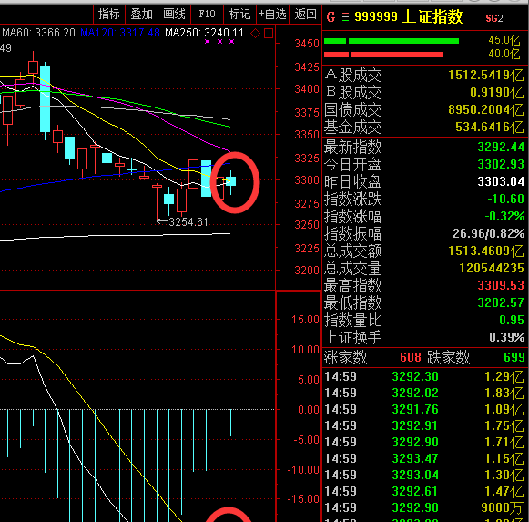 12月15日操盘策略:压力3320点;强支撑3280点。周四大盘冲高回落,午后小幅跳水,收盘跌10.6点或0.32%,报收3292.44点,收带上下影的小阴线,再度失守5日和10日线及3300点,仍然还在区间震荡中,即将面临变盘选择方向。MACD绿柱缩短,白线拐头向上,有望向上金叉黄线,KDJ向上发散。板块方面:供气供热、次新开板、新零售、ST板块、商业连锁、黄金、摘帽、3D打印、化纤等板块涨幅1.1%以上居前,保险、证券、稀土永磁等回调。两市28家涨停,无跌停,个股涨跌互现,成交量较上日小幅增加到1513亿,近期成交量持续低迷,说明目前市场观望气氛较浓,场外增量资金不愿入市。资金方面:沪股通资金流入2.4亿多,深股通净流入4.6亿,银行、保险、证券等大金融回调拖累大盘指数。