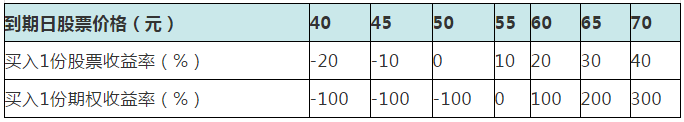 下面用一个例子来说明期权的杠杆性。假设有一支股票价格是50元,对应的一份行权价格为50元的认购期权的权利金为5元。那么投资者可以用50元可以购买一份股票或者花5元购买1份期权。表4列出在到期日时,股票在不同价格下两种投资的收益率。