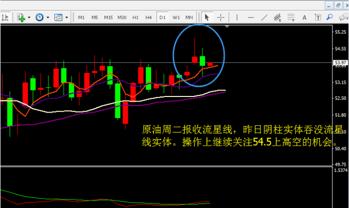 原油方面,笔者昨天就已经给出分析。周二日线报收流星线,且与周一阳线有跳空,所以这是一个理想的见顶信号。昨日高位盘整,欧美盘震荡下行,最低试探53.37,回调力度整体较大。昨日日线报收较长上下影线阴柱,阴实体直接吞没之前流星线阳实体。目前原油再次回到日均线MA5上,操作上继续关注54.5高空,下方看53.7破位情况。