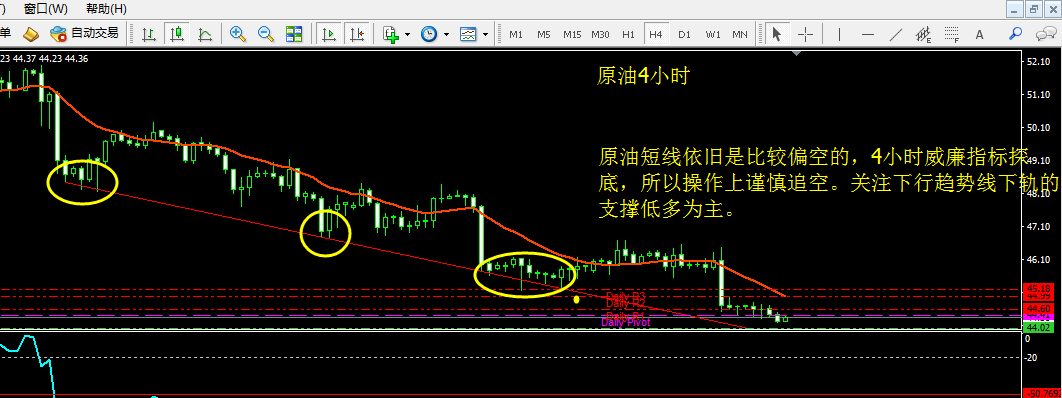 原油昨日小幅反弹之后再次新低,最低试探44.2一线。目前4小时威廉指标探底,加之接近之前43.7的低点,所以操作上谨慎追空。今日低多为主,比较理想的位置是新低跟多。