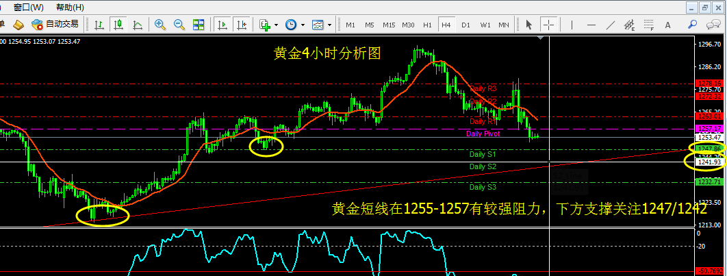 昨日黄金亚盘触及1266之后,欧美盘延续震荡下行格局,最低触及1251一线。黄金日线再次报收带上下影线中阴柱,受阻于日线布林带中轨。黄金昨日晚间大幅下探之后反弹修正,最高触及1255.今日1255-1257成为黄金反弹的阻力位,下方支撑关注1247/1242/1230-1232。