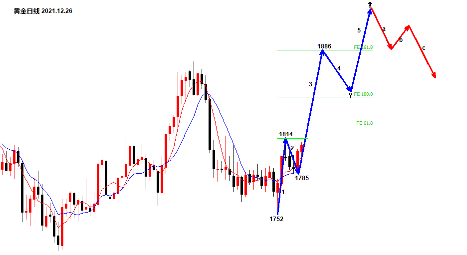 当然,如果要确认修正动作真正完成,唯一的条件是1814必须破位,这样的话上方空间才能打开,强势行情才可以真正确认。除此之外,日线主升3浪才有可能更好地运行,如下图所示,是一张黄金日线浪型推演图。