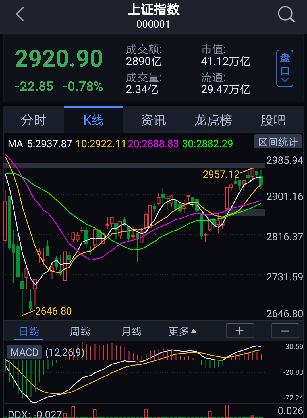 1.MACD指标在0轴上方,显示大盘处于强势。
