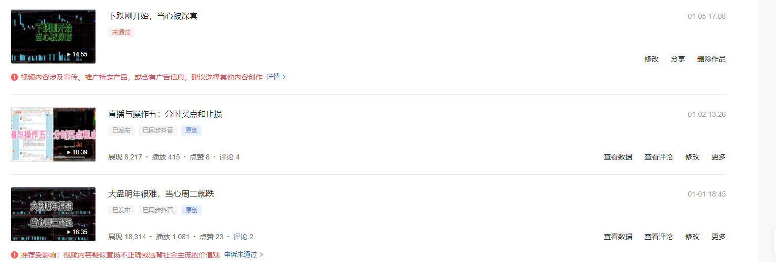 元 旦 期 间 录 制 的 两 个 提 示 风险 的 视 频, 都 不 能 被 通 过, 最 为 可 气 的 是 一 月 一 日 标 题 为:“大盘明年很难,当心周二就跌”, 被 说 成 是 疑 似 宣扬 不 正确 或 违背 社会 主 流 的 价值 观, 并且 申诉 也 不 能 通 过。 拭 问, 这 是 哪 国 的 道理? 那 些 听 信 了 你 们 认 可 的, 符合主流价值观的,无 脑 看 多 者 的 胡 说 八 道 ,而 没 有 看 到 我 的 正确 提 醒 而 赔 的 钱, 你 们 负责 不? 这口气憋了好几个月了,每每想起来就感觉无助。今天憋不住了,就算被某条封了,也得说出来了。