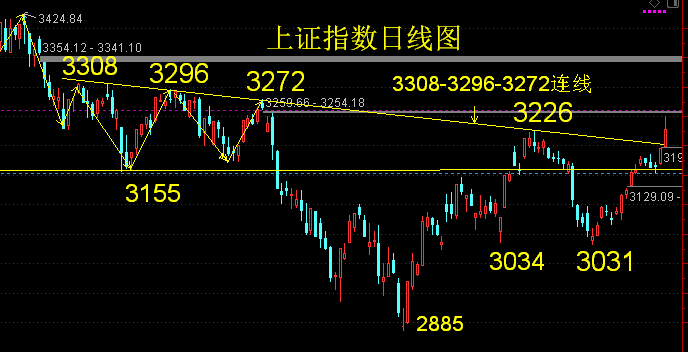 昨天一举突破了3308-3296-3272-3226点连线的阻力位。