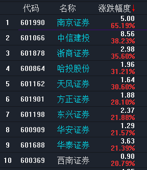 南京证券以涨幅65%排名第一,中信建投排名第二,浙商证券排名第三。