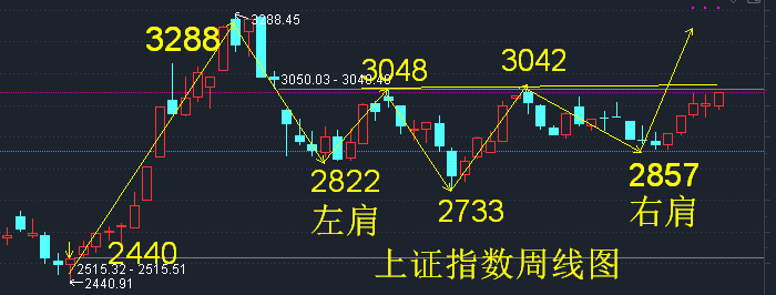 上证指数周线图是一个头肩底形态,颈线位是3048与3042点的连线。一旦突破颈线位则是向上发起总攻的开始。