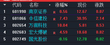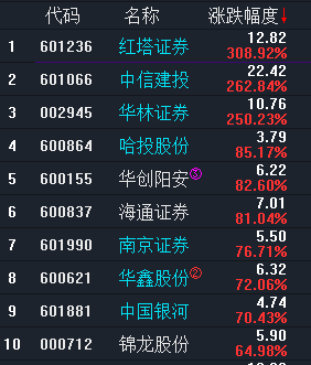 红塔证券排名第一(新股原因,发行价比较低导致涨幅第一)。
