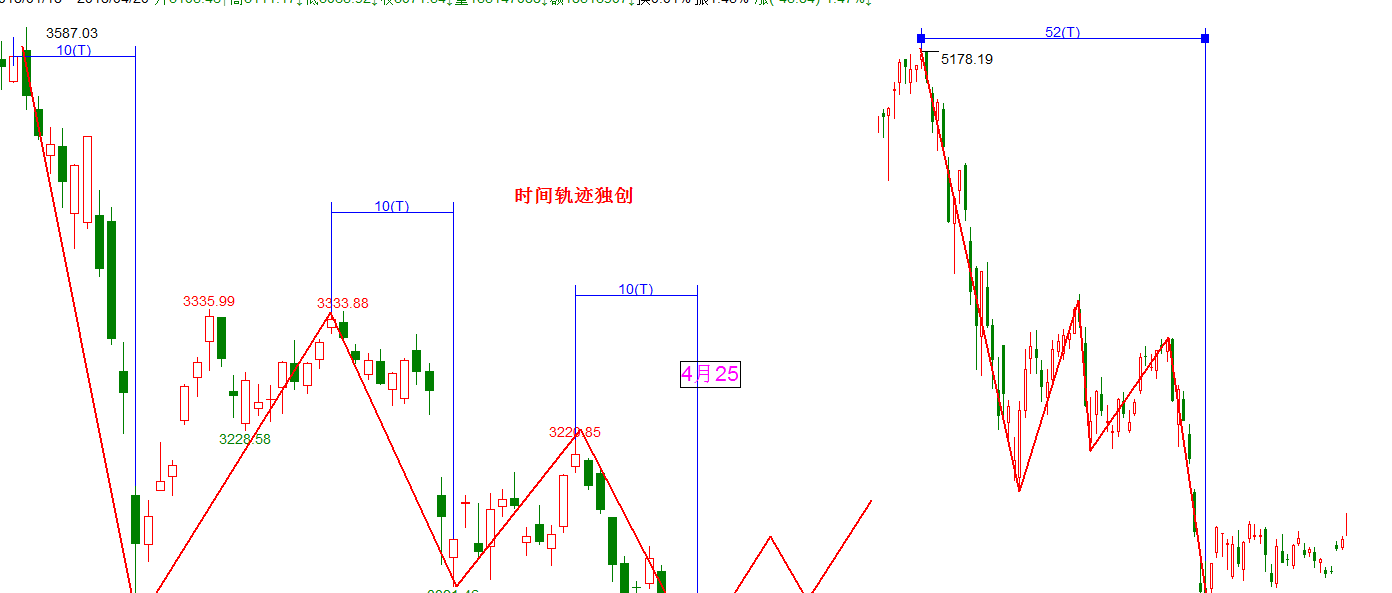 时间:18号是低点没错,市场已经验证,但是市小级别,下个时间点在4月25号,从图形看3587下跌分位三段,每段10个周期,3041最好破掉。