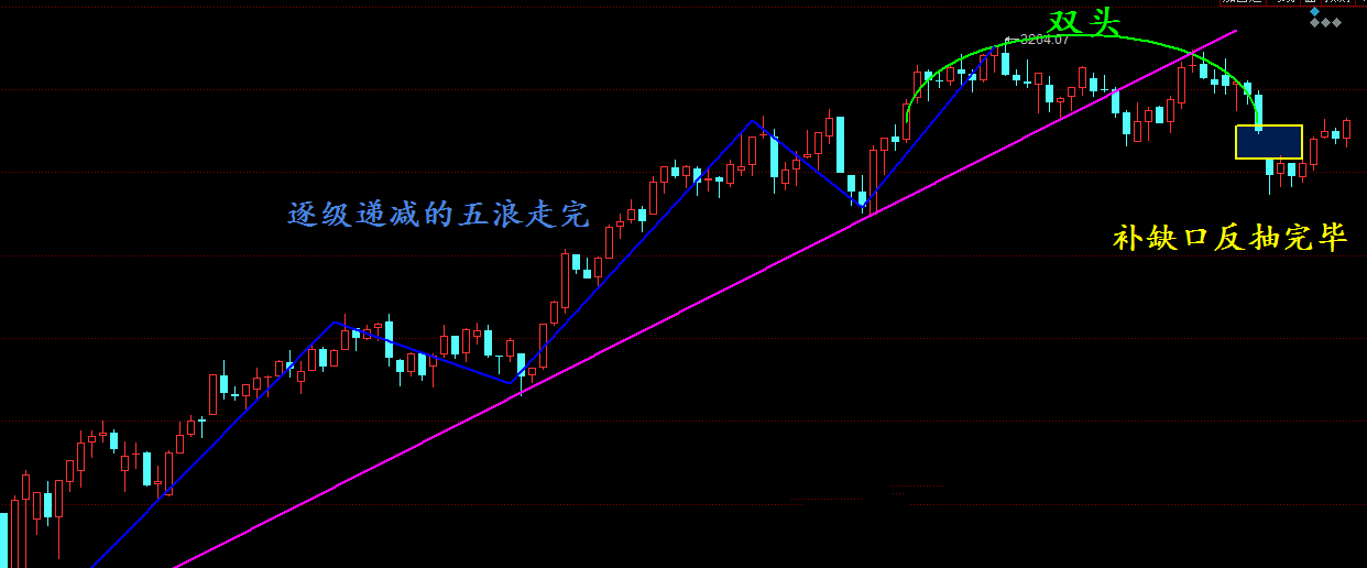 具体看大盘60分钟K线图,破位上升趋势线后反抽完毕,形成绿色双头结构,今天的小阳线一方面是刚好回补了周五的缺口,另一方面明显是在本图上做右肩!