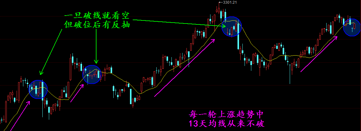 看大盘日线图,牛哥当前就给出一条黄色13天均线,请点击放大仔细看,大盘每一轮上涨途中是从来不会真正让收盘破了它的,一旦破了就是要开始调整浪!没有例外……当然,每次破位13天均线后都有反抽13天均线的阶段,但每次反抽的时间难以确定:7月底只反抽了两天,8月底反抽了十天,12月初反抽了五天。