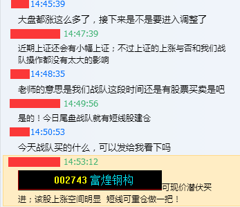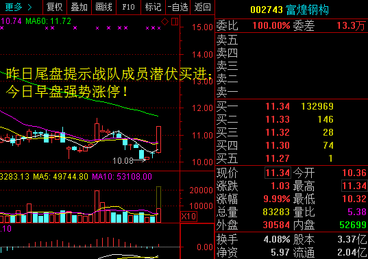 好样的!昨日尾盘提示朋友们潜伏买进的 002743富煌钢构 今日收获涨停,不管大盘上涨与否,只要你严格按照提示操作,赚钱就是那么简单的事!把握不好的朋友切勿盲目去操作。切记:专家属于自信者,奇迹是属于执着者,成功就必定属于耐心者。