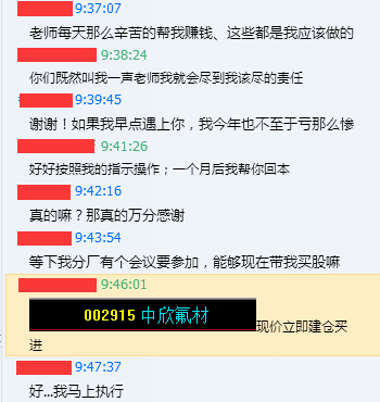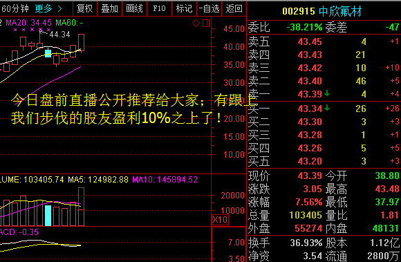 实力见证!今日盘前直播公开推荐给大家的 002915中欣氟材 盘中大涨7%之上;有跟上我们步伐的股友都有10%之上的利润了!上天不负有心人;经过本博精心分析的票都是好样的;没有一个是孬种!真正的大牛股是经历了强势快速洗盘后走势将会更强、更加健康!