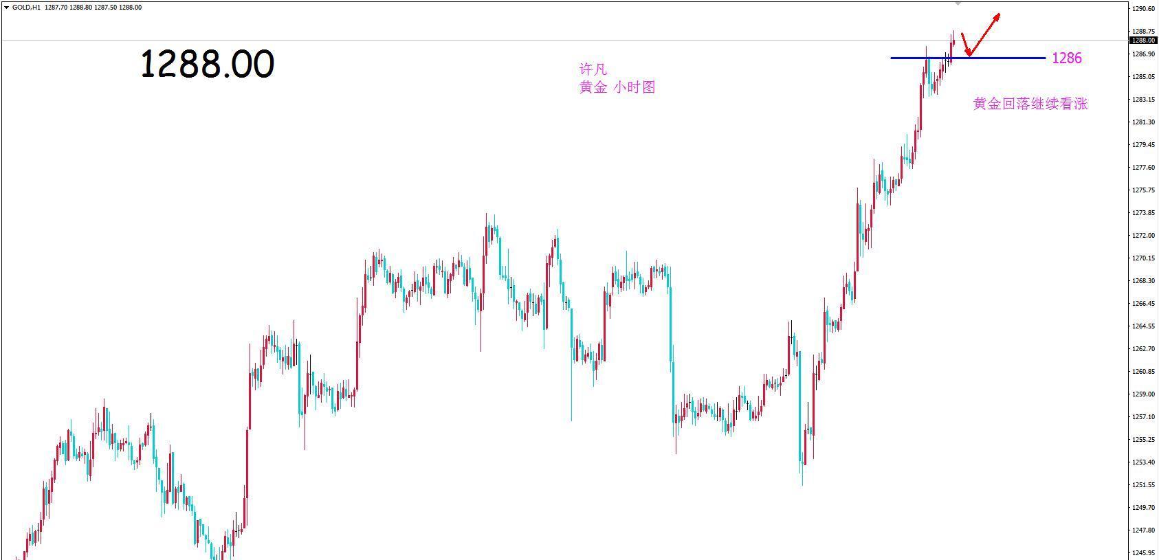 昨天黄金继续延续单边上涨的走势,上涨过程中也想过周三周四这两个交易日的行情会比较像,所以在昨天的操作上,进场多单也比较激进,但也正好是最低点位。单边上涨日线以阳柱收尾,顶着日线布林带上轨继续向上运行,配合目前向上开口运行的布林带趋势,黄金接下来还有上涨的空间,而下方5日均线和10日均线在周二反转走高之后,也以金叉看涨信号继续上行,所以黄金今天继续大胆看多,也许不会像前两天那样大涨,但今天目标1295是看好的。小时级别中,昨天黄金以1277起涨,美盘给出1287高点后收阴回落,但低点只给出1283就开始在午夜继续震荡走反弹,踩着10日均线上行,那么今天下方关注的支撑点位是1286,然后继续看涨,参考前两日的上涨走势,今天黄金操作起来还是要激进做多。综合分析,黄金从低位1252反转走高以来,一直都是单边上涨的走势,回调的力度有限,基本上是调整2-3个点继续涨,所以说,今天黄金不能考虑去做回调了,或者是说像周二晚间那样,已经走出5个点的回落力度,但趋势还是看跌,那可以考虑去追空,否则,今天的操作思路以回落做多为主。操作建议:1286多。